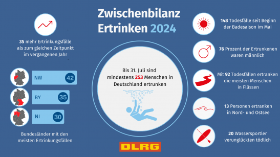 In den ersten knapp sieben Monaten des Jahres 2023 sind deutschlandweit mindestens 192 Menschen in deutschen Gewässern ertrunken - 21 Personen weniger als zum gleichen Zeitpunkt im vergangenen Jahr (Stichtag 25. Juli). In Schleswig-Holstein ereigneten sich in diesem Jahr bisher 9 Todesfälle durch Ertrinken, im Vorjahr waren es 12. „Der Sommer macht nun schon eine längere Pause. Andernfalls läge die Zahl der Ertrunkenen sicher nahe der des Vorjahres“, sagte die Präsidentin der Deutschen Lebens-Rettungs-Gesellschaft (DLRG), Ute Vogt, Anfang August bei der Vorstellung der Zwischenbilanz zu Ertrinkungsunfällen in Hamburg. Insgesamt 123 Menschen kamen seit Beginn der Badesaison Anfang Mai im Wasser ums Leben, 13 weniger als im Vergleichszeitraum 2022. „Wie schon vergangenes Jahr lockte ein s ... Mehr erfahren